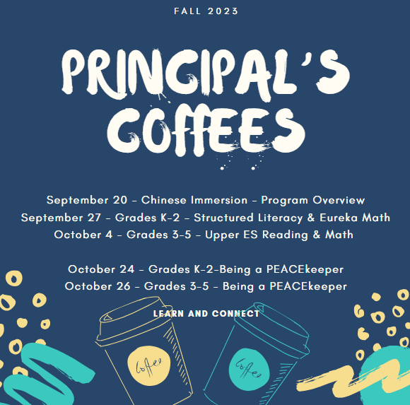 Principal KT is hosting a series of five coffees for parents and caregivers in September and October. The first three coffees will provide a curriculum overview for the Chinese Immersion Program, Lower Grades (K-2), and Upper Grades (3-5). The final two coffees will provide an overview on the PEACEkeeper initiative that Principal KT is launching in partnership with the teachers this year. These presentations will also be grade specific.