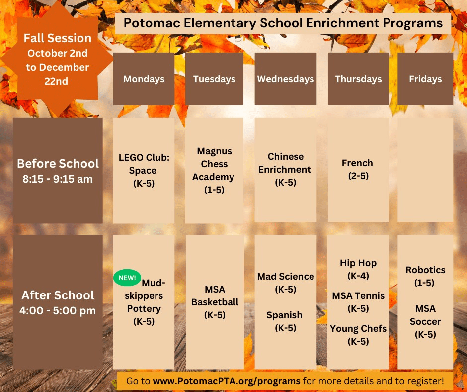 Important Note: The PES PTA is committed to providing parents with information on opportunities available for children. Unless otherwise specified, the programs outlined on this page are not endorsed by the school, PTA, or MCPS. Parents must contact vendors directly with questions and for registration information. We encourage parents to research any and all programs before signing up their children. We also welcome feedback and suggestions from parents as we curate this list.