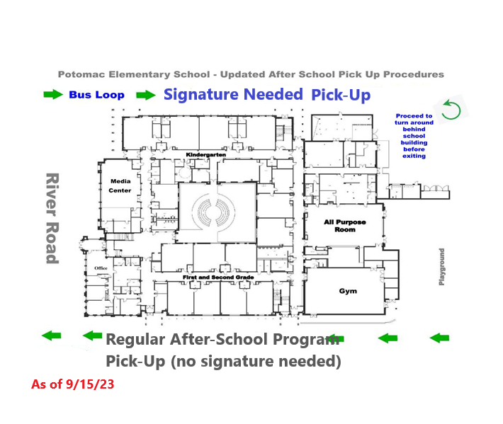 - After School Programs: Please utilize the pick-up lane indicated in gray below for regular after-school programs pick-up. If you plan on walking into the school to pick up your child, please do not block the pick-up lane. Instead, park in the designated parking area. Programs which require a signature for pick-up will utilize the bus lane indicated in blue below.