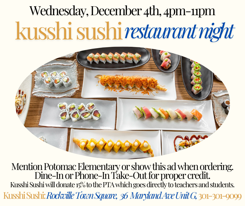 12/4 Kusshi Sushi Restaurant Night 23Nov 20247 Dec 2024 Restaurant Night Wednesday, December 4th from 4pm-11pm at Kusshi Sushi in Rockville Town Square (36-G Maryland Avenue, Rockville, MD | 301-301-9099). Dine-In and Phone-In Take-Out Orders receive credit. Thank you!! Share this:TweetLike Loading... Related