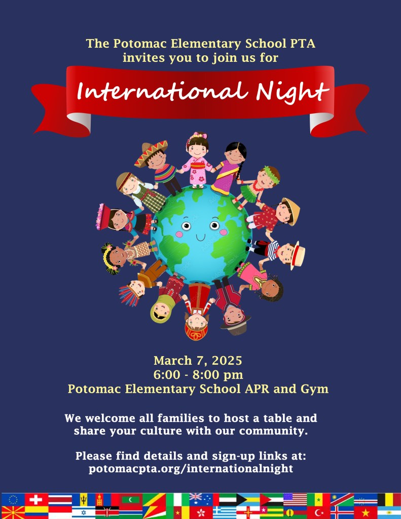 Please join us for International Night 2025 on Friday, March 7th from 6:00-8:00pm in the PES APR and Gym! Students and their families will have an opportunity to learn more about the many cultures that make up to our school community, view traditional outfits, and experience new foods.