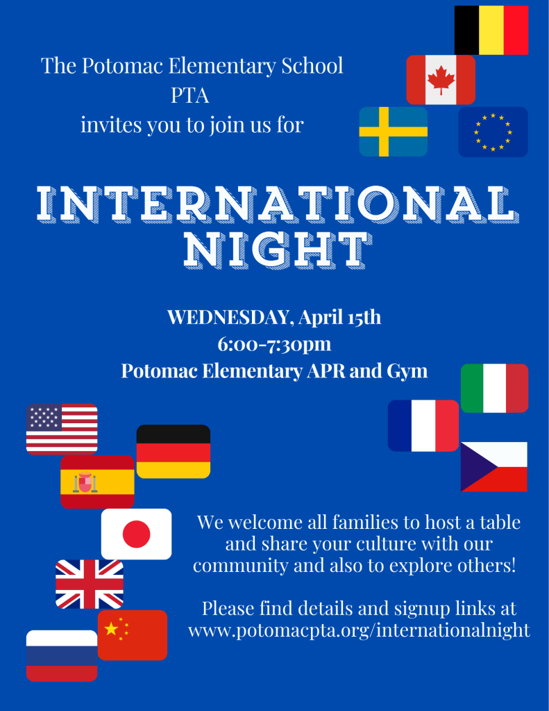 Please join us for International Night 2026 on Wednesday, April 15th from 6:00-7:30pm in the PES APR and Gym! Students and their families will have an opportunity to learn more about the many cultures that make up to our school community, view traditional outfits, and experience new foods.