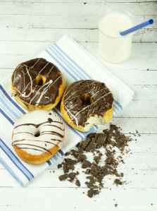 three assorted donuts with milk