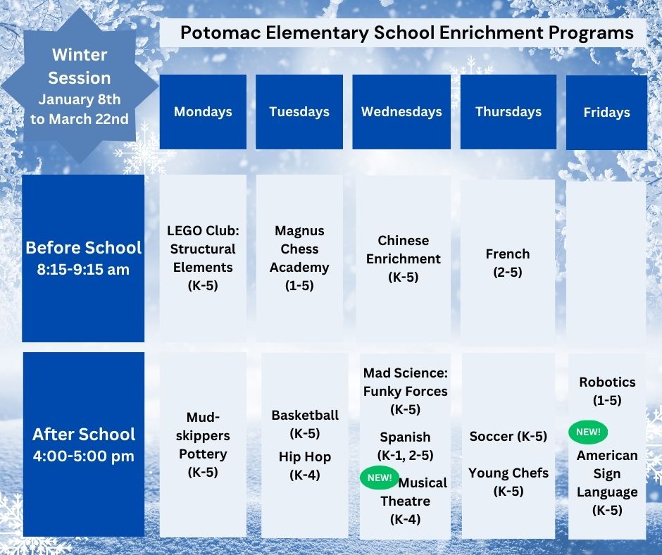 | Wednesdays | Chinese Enrichment and Homework Help (K-5) | Introductory Spanish (K-1) Beginner Spanish (2-5) Mad Science: Funky Forces (K-5) Tommie Shaw: Disney Musical Theater (K-4) |